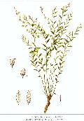 多年生草本,高30 cm。根圆柱形,弯曲,颇长。茎由基部丛生、斜生或直立,绿色,近无毛。叶互生,线形至狭线形,长1~3cm,宽0.5~1mm,偶为3mm,先端尖,基部渐狭成短柄,全缘。总状花序有稀疏的花,花绿白色,带紫,左右对称;萼片5片,外轮3片小,内轮2片,花瓣状;花瓣3,下部合生,中央花瓣较大,呈龙骨状,顶端有流苏状附属物;雄蕊8,花丝愈合成鞘状,近上端则分离,通常摺合,包围雌蕊于中央;子房上位,柱头2裂,不等长。蒴果卵圆形而扁,翅宽1 mm以上。种子卵形,扁平黑色,密被白色细绒毛。花期4~5月,花后果实不久就可成熟。