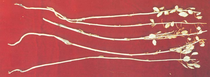 全草长15~55cm。根细长圆锥形;表面灰黄色,质硬脆易折断,折断面不平坦。茎圆柱形,直径1~5mm;表面灰黄色或灰绿色,有细纵棱;质脆易折断,折断面中央有白色疏松的髓。叶多碎落。总状果序生于茎枝顶端及叶腋;果实卵圆形而扁平,长8~15mm,宽5~13mm;表面灰黄色或灰绿色,中央略隆起,边缘有翅,宽1.5~3mm,两面中央各有1纵棱线,先端凹陷,基部有细果梗,长约1cm;果实内分2室,中间有纵隔膜,每室有种子5~7粒,果实开裂后,留下1纺锤形的白色膜状中隔。种子扁圆形,宽约2mm;表面棕黑色,两面各有5~6条突起的偏心性环纹。气微,味淡。