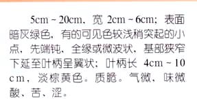 性状鉴别 叶片微皱折,呈长卵圆形或狭长卵圆形,长5~15cm,少数可达17cm,宽2~6cm。叶端尖或渐尖,基部钝圆,全缘,有的边缘有微波状刺。上表面棕黄色或棕黄绿色,下表面色较浅,网状脉明显,在脉上有疏毛;主、侧脉在上表面均近平坦,在下表面均显著突出。纸质,质脆易碎,气微弱,味稍苦而微涩。