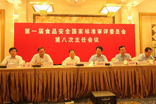 2013年7月15日, 在北京,第一届食品安全国家标准审评委员会第八次主任会议正式召开。第一届食品安全国家标准审评委员会常务副主任委员、国家卫生计生委副主任陈啸宏出席会议并讲话,副主任委员、技术总师陈君石院士主持会议。会议审议通过《食品安全国家标准审评委员会章程》修订建议,通报食品标准清理工作进展情况,审议通过了71项食品安全国家标准。食品安全国家标准审评委员会秘书长、副秘书长、各专业分委员会主任委员以及工业和信息化部、商务部、农业部、质检总局、食品药品监管总局、国家标准委等部门代表参加会议。