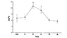 (四) 肺灌洗液PMN中胞浆游离Ca2+ 的变化(图6)伤后2h肺灌洗液PMN中胞浆游离Ca2+ 即有升高,但与对照相比无显著差异,4h达到峰值(与对照相比,P<0.01),随后降低,至12h已恢复到伤前水平。