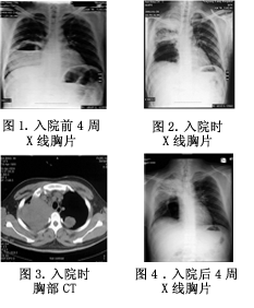 患者2个月前无明显诱因发热,体温最高达 38.3℃,伴全身乏力,轻度咳嗽、咳少量黄色黏痰,无胸痛、盗汗。X线胸片示右肺下叶高密度片状影,血常规:白细胞(WBC)8.27×109~18.7×109/L 中性粒细胞(GR%)68.2%~75.8%血红蛋白(Hb)由132 g/L降至110 g/L;尿常规正常。8次痰培养仅1次发现“热带念珠菌”。先后予左氧氟沙星、阿莫西林/克拉维酸、头孢哌酮/舒巴坦抗感染治疗,患者病情无改善。6周前胸部CT示:右肺脓肿并局部胸膜增厚。换用万古霉素、甲硝唑治疗1周无效,改用亚胺培南/西司他丁2天、去甲万古霉素2天,患者仍有高热,伴咳嗽、咳脓血痰。4周前X线胸片示右下肺团块影内出现宽大液平,诊断“急性肺脓肿”见图1。