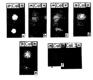 图2 同例的LSC的DNA图和相应分布区细胞图。A图为DNA曲线分析图 以DI值表示各峰,如(a)1.00,(f)2.00;B图为不同DI值的细胞分布图;C图为相应于A、B图中不同DI值区的系列细胞形态图。从图中可以看到a区是淋巴细胞(二倍体);b,c,d,e区是不同异倍体的肿瘤细胞;f区为四倍体细胞。