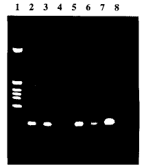 1.pBR322/hinf1,2.阳性对照,3、5、7.阳性标本,4、6.阴性标本,8.阴性对照