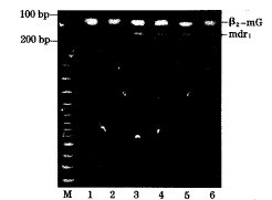 利用逆转录多聚酶链反应(RT-PCR)技术和设定的两对引物,分别得到mdr1 157 bp和β2-mG 114 bp产物,同一批反应的不同样本,在扩增模板量相同的情况下,其mdr1表达明显不同,而β2-mG表达却基本相同,PCR的阳性结果以肉眼能见其电泳扩增带为判断标准,当被检标本经PCR后同时出现mdr1及β2-mG基因PCR电泳扩增带时,判定该标本mdr1 PCR检出阳性,结果如图1。