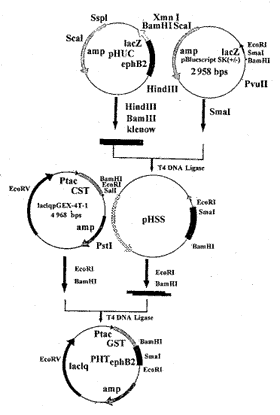 1.1 材料 质粒pUC19,pBluescriptSK(-),pGEX4T-1,菌种D H5α,JM109本室保存。编码EphB2胞外的配体结合区基因的重组质粒pGE42(又名phuc)本室构建[5];DNA重 组所用各种限制性内切酶、T4 DNA连接酶及Klenow片段,购自Borringer公司,纯化质粒DNA 所用的Kit(Wizard),DNA回收kit,IPTG,X-gal购自Promega公司。