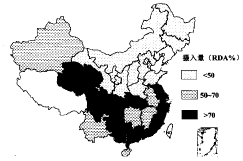 图3为我国各省城乡居民核黄素摄入量分布。华北区的北京、天津、山东,东南区的江苏、安徽、上海、浙江、福建、广东,青藏区的青海等省市核黄素的摄入量较高,每标准人日摄入量0.8~1.0mg,占61.2%~75.4%RDA。西北区的内蒙、陕西、山西,西南区的云南、 东南区的广西、海南、湖南为核黄素摄入量较低的省份,每标准人日摄入量0.6~0.7mg,占48.2%~51.9%RDA。其余省份居中。