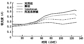 3. 细胞生长的测定:将SKOV3和CAOV3接种入96孔板中,每孔2×103个细胞,3个实验组的细胞分别用浓度为5 ng/ml的羟基喜树碱、topotecan和顺铂的培养基培养,对照组培养基不加药物。每组每天取4孔进行MTT快速比色,共8天,绘制细胞生长曲线,用曲线回归法计算倍增时间。