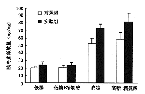 在低糖Hanks液中温育2小时后,实验组和对照组胎鼠胰岛素释放量都较低,分别为(24.22±4.63)ng/mg,(20.52±2.31)ng/mg,属基础分泌水平,但实验组较对照组高(P<0.05);将低糖Hanks液换为高糖Hanks液温育2小时,两组胎鼠胰岛素释放量都明显增加,分别为(73.73±5.94)ng/mg,(53.35±7.53)ng/mg,实验组增加更明显(P<0.01);实验组刺激指数较对照组高(实验组刺激指数=3.04,对照组刺激指数=2.59)。加入10mmol/L精氨酸,对两组胎鼠低糖温育时胰岛素释放量均无明显影响,但能提高高糖刺激时的胰岛素释放量,实验组更加明显。见图1。