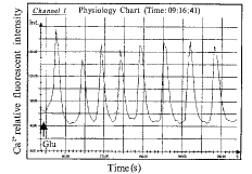 观察了86个大脑皮质神经细胞在Hanks液中经1 mmol/L谷氨酸作用后细胞内游离Ca2+的变化,结果表明:71%的细胞内游离Ca2+ 发生振荡,其波型均为尖峰型(图1);15%的神经细胞内游离Ca2+以迅速或缓慢方式上升,而14%的神经细胞内游离Ca2+浓度无明显变化。