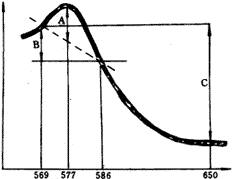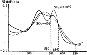 其中实线是100%氧化的血红蛋白的吸收光谱特性,虚线为0%的血红蛋白的吸收光谱特性,所谓的血氧饱和度就是全部血红蛋白中氧化的血红蛋白的比例数。由于氧化的血红蛋白和未氧化的血红蛋白在569mm和650mm二个波段上吸收率是一致的,但大小是不同的。当血红蛋白总量增加时,二个波段上的吸收率之差也增大,故二个波段上吸收率之差的大小反映了血红蛋白总量的多少。根据日本住友株式会社提供的方法(见图6),被测组织的血红蛋白IHb为: