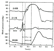 其中:距离Δl为主动脉瓣在体表的投影处至桡动脉切脉部位(寸、关、尺)之间的实际距离,我们是按胸骨中线第三肋骨水平点至桡动脉关部的弯曲距离测量和计算;时间Δt为脉搏波从主动脉瓣传至桡动脉关部所用的时间。由心脏动力学过程与心电活动的关系[5]可知,左心室、主动脉、桡动脉与心电波的时间延持关系如图1所示。那么,Δt应该为主动-脉波