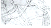 图5血琼脂基37℃培养7d后镜下见圆酵母样细胞形成的菌丝(×40)