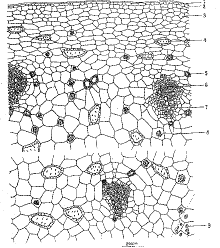 1.腺毛 2.角质层 3.表皮 4.层角组织 5.木栓组织 6.草酸钙簇晶