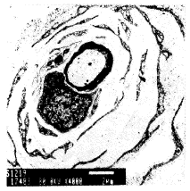 图2 轴索周围没有髓鞘。提示髓鞘形成不良