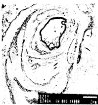 图1 神经纤维数量明显减少,轴索周围仅有少量同心圆板层髓鞘形成(白色箭头),伴有大量胶元纤维(黑色箭头)。许旺细胞系膜卷绕轴索形成的典型葱皮球提示卷绕过程的障碍