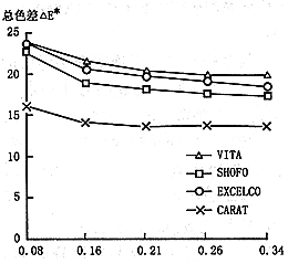 以各样本第五组△E*作为色差极限值,以人眼能区别的最小色差值1.5作为△E*的可接受范围,利用计算机选取图2曲线上有效点,计算出各品牌不透明层的最适范围分别为:VITA: 0.21~0.15mm,SHOFO:0.19~0.16 mm,CARAT:0.14~0.07 mm,EXCELCO:0.17~0.14 mm。