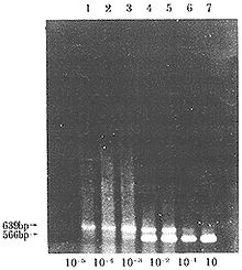 用正常骨髓DNA按10倍比例系列稀释HL60细胞DNA,然后取各稀释度DNA1μg(从纯的HL60细胞DNA1μg,即100起),按前述的条件进行酶切、PCR扩增及结果观察。