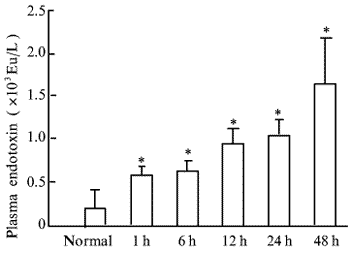 Fig 1 Changes of plasma endotoxin levels in rats of normal and TAA group after TAA injection 1\, 6\, 12\,24\, 48h.(n=6,