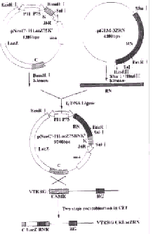 重组质粒pNeoC′-11LacZ75RNK′的构建:用XbaⅠ,HindⅢ双酶切pGEM-3ZRN,回收RN基因, Klenow补平后,连入pNeoC′-11LacZ75K′ /BamHⅠ(先经Klenow补平位点)。经酶切鉴定,筛选正向克隆,使RN基因的表达受P7.5启动子的控制,构建成pNeoC′-11LacZ75RNK′。