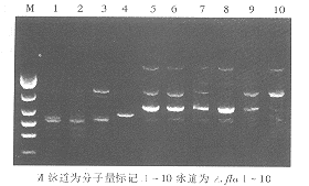 2.RAPD分析:PCR反应体系为25μL,成分包括10×缓冲液2.5μL,MgCl2(15mmol/L2.5μL),dNTPs(各2.5mmol/L1.25μL),Primer(7.5ng/μL)2.0μL,TaqDNA聚合酶(5U/μL)0.4μL,模板DNA(约10ng/μL)1.0μL,以四蒸水补足至25μL,混匀,加石蜡油20μL覆盖反应液。扩增反应条件为94℃预变性40s;接着94℃变性20s,35℃退火1min,72℃延伸1min,共45个循环;最后72℃延伸10min。扩增反应在日本Sanyo公司生产的DNA扩增仪中进行。取反应产物10μL与溴酚蓝加样缓冲液2μL混匀,在含溴化乙啶的质量分数2%琼脂糖凝胶上在1×TBE缓冲液中电泳,80V2.5h。电泳后取出凝胶于紫外分析仪观察。所剩反应产物存-20℃,待统一电泳照相。