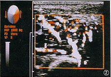 (2)囊性淋巴管瘤与海绵状血管瘤:外形不规则,内为多发性液区。前者边界较清,液区清亮,呈“多房状”;后者边界多不清,液区呈“蜂窝状”及“管道状”,可伴声影的强光斑,头低位增大明显。CDFI:后者较大囊腔内可见暗淡的片状血流,动、静脉亦多,挤压与瘤腔相通的静脉,瘤腔内彩色血流出现相应的闪动现象;而前者只是分隔上见彩色血流。