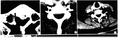 颈部神经鞘瘤4例位于颈动脉三角区,1例位于腮腺前下方,1例见于咽侧间隙。表现为圆形或类圆形软组织肿块影,边缘光滑,密度均匀或不均匀,低于肌肉密度,CT值35Hu-42Hu,注入造影剂增强扫描见病灶强化明显2例,不均匀强化2例,颈部血管受压移位(图3)。