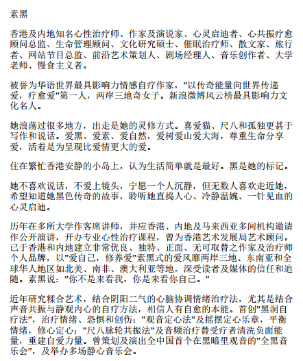 素黑,香港心性治疗师、作家、心灵启迪者。香港中文大学文化研究硕士,心疗顾问有限公司创办人。历年在多所大学做客座讲师,并应香港、大陆及马来西亚多家商业、传媒及教育机构邀请作公开演讲,开办专业情绪及心性治疗课程,亦担任商业教育机构情绪教育顾问工作。