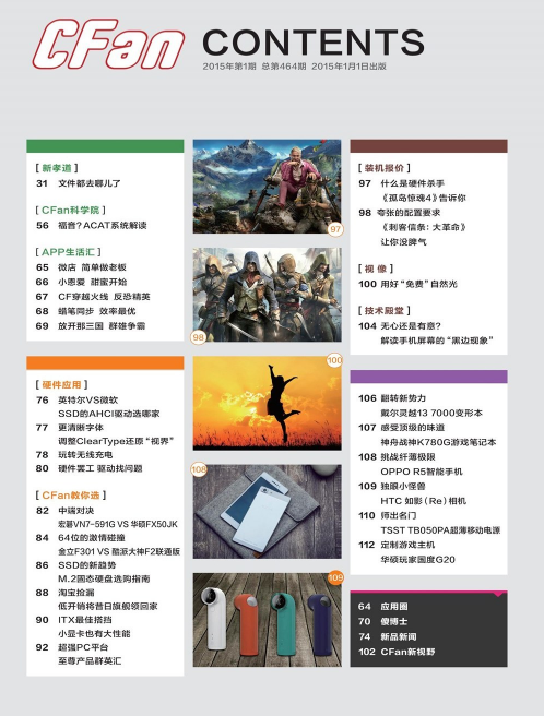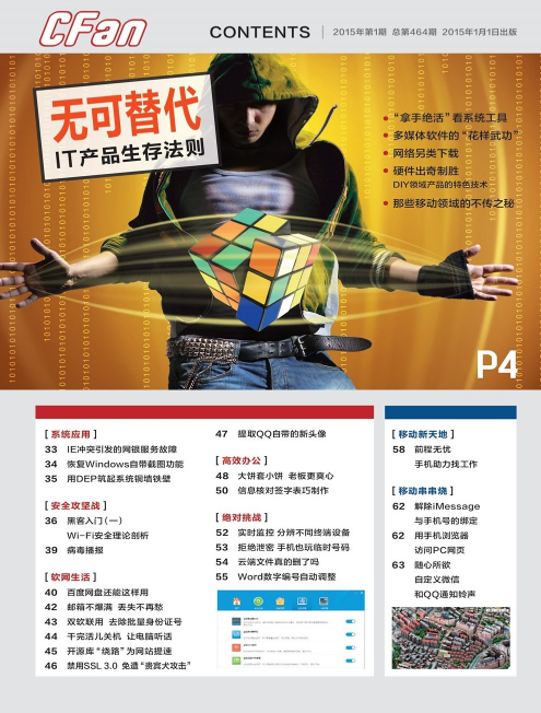电脑爱好者2015年01期这一期的科技新闻包含了对电脑新产品的介绍,it产品生存法则,如何挑选CFan,努比亚手机拍照的新特点,视频拍摄手法等等。