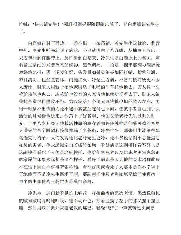 抓药的伙计叫来了白嘉轩和鹿子霖。俩人几乎异口同声问:“先生哥,你可回来了!”冷先生坐在他的那把罗圈椅子上:“差点儿回不到咱原上