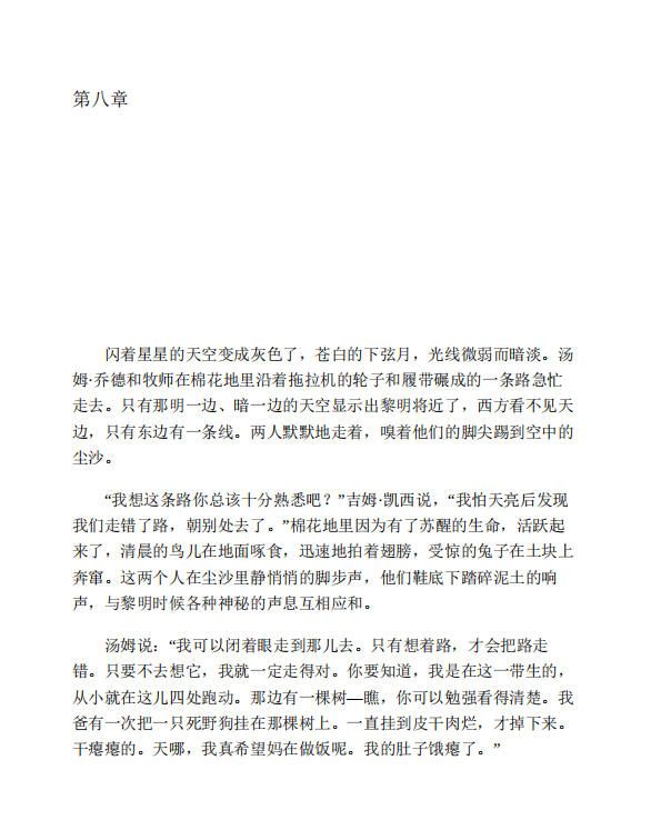 们避开了蛇,继续向前走去。东方的天空出现了一丝光彩,不一会儿,冷清清的曙光悄悄地照到了地上。棉花丛上现出了绿色,大地变成灰黄