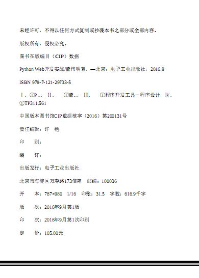 1、伟明把他个人多年Web开发的经验,以及豆瓣十年来数百名优秀工程师在Web开发上实践的积累,凝聚在了这本书里,多维度、全面地介绍了Python Web开发涉及的各种技术。我向所有有兴趣使用Python做Web开发的开发者们,强烈推荐此书。