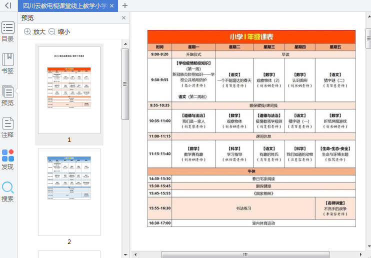1.小学课表供我省疫情防控延期开学期间小学1-6年级使用。学校疫情防控知识、学科教学、国家相册、名师讲堂等相关课程资源从3月9日开始通过有线电视、IPTV、网络平台进行推送。