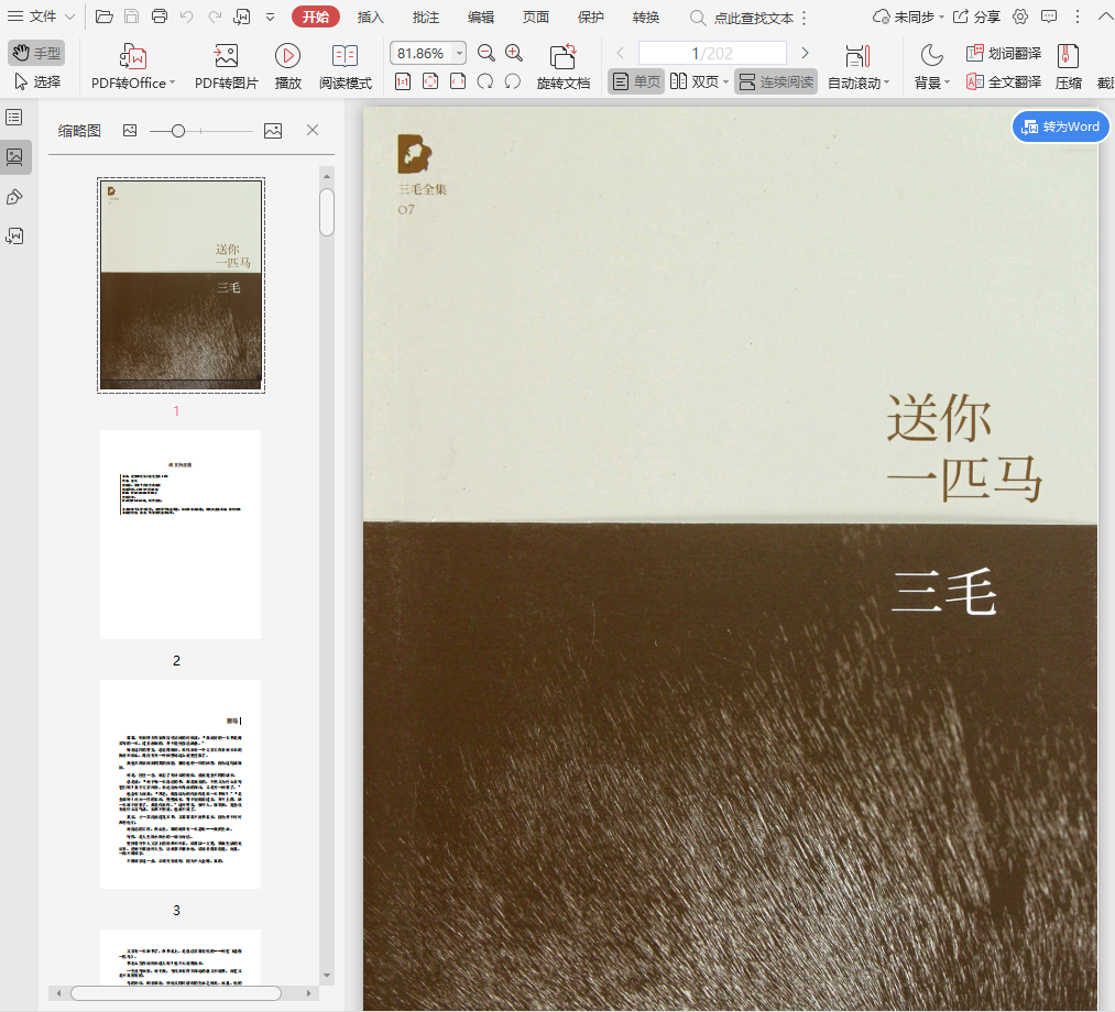 3、很喜欢三毛,从那一本记录了各国流浪的《万水千山走遍》开始,喜欢她的率性,喜欢她文字的平易近人,还有她幸福却又悲伤的经历。不过,那是高中时候对她的印象,自由,率性,坦诚,美好。那是高中时候对她的印象,因为喜欢文字,所以一直期盼着能有她那样的生活。不过,最近读完《送我一匹马》之后,我才觉得了解她更深了一些。