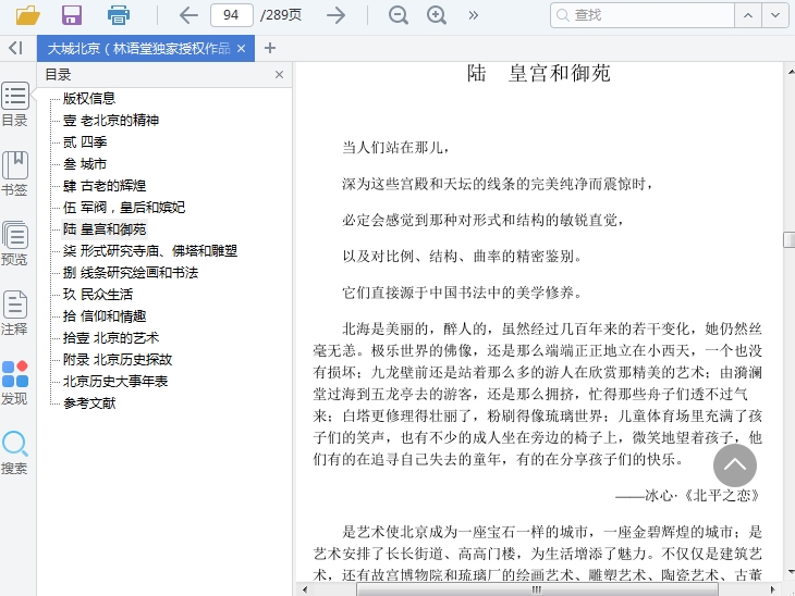 林语堂旅居美欧数十年,用多部传世经典专著,向西方介绍光辉灿烂的中国文化。本书旁征博引,纵横捭阖,以丰富的文史资料和自由的行文风格,重新演绎了北京数千年的历史演变,北京文化的各个层面——内城与外郛、市区与郊野、皇室与民众,以及皇宫、御苑、寺庙、佛塔、雕塑、绘画、书法等城市名片也尽收其中。本书以真实准确的纪实性、引人入胜的可读性、高品位的艺术性,全方位再现原汁原味的北京,是贴心体会北京精神的大成之作!