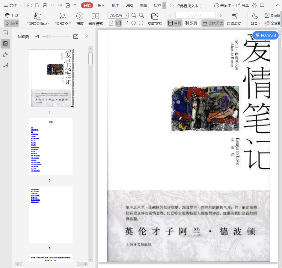 英伦才子阿兰·德波顿,一位不乏米兰·昆德拉的批评深度,深具罗兰·巴特尔的解构气质;但,比昆德拉有更立体的爱情思维,比巴特尔更熨贴恋人的爱情神经,激活人们全新的阅读体验。 本书是一部融合理性与感性,细腻生动的恋爱过程的全记录。忠实记下与女友交往中的各个细节,特别是心理和哲学层面的思考 ,文字生动,处处机锋,不仅有极大的阅读乐趣,阅毕更令人回味无穷。
