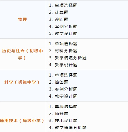 上面就是可以报考的科目,科目三考试时间120分钟,分数150分。考试题型根据报考科目有所区别,下面是详细的考试题型表。
