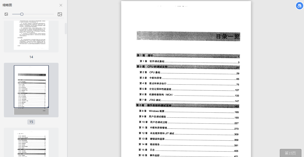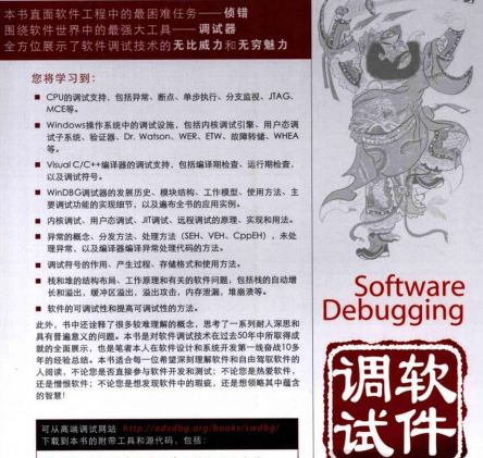 田绕如何实现高效调试这一主题,本书深入系统地介绍了以调试器为核心的各种软件调试技术。本书共30童,分为6篇,第1篇介绍了软件调试的概况和简要历史。第2第以英特尔架构(IA)的CPU为例介绍了计算机系统的硬件核心所提供的调试支持,包括异常、断点指令、单步执行标志、分t监视.TAG和MCE等.第3第以Windows操作系统为例,介绍了计算机系统的软件核心中的调试设施,包括内核调试引擎、用户苏试子系统、异常处理、验证器、储误报告、事件追踪、故障转储、硬件情误处理等.第4萌以Visul CC++箱译器为例,介绍了生产软件的主要工具的调试支持,重点讨论了编译期检查、运行期检查及调试符号.第5篇讨论了软件的可测试性,探讨了如何在软件架构设计和软件开发过程中加入调试支糖,使软件更容易被调试,在前5篇内客的基础上,第6篇首先介绍了调试器的发展历史,典型功能和实现方法,然后全面介绍了WinDBG调试器,包括它的模块结构、工作模型、使用方法和主要调试功能的实现细节。