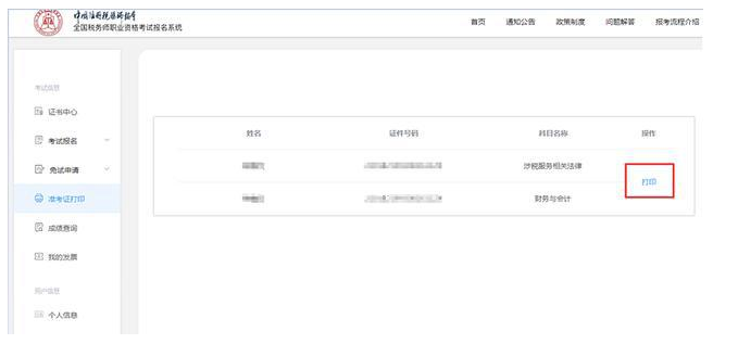 第一步、登录全国税务师职业资格考试报名系统,找到准考证打印选项,点击打印;