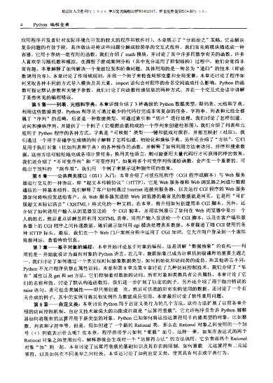 欢迎进入Python的世界!希望通过我们艰苦的努力,带给读者一本内涵丰富、寓教于乐的计算机参考书。为此,我们采用了多种方法,最终写成了一本与众不同的Python参考书。例如,我们很早便讲解了Python如何与公共网关接口(CGI)配合,以便编写基于Web的应用程序。这样来,便可在本书剩余部分,更好地演示大量动态的、基于Wcb的应用程序。本书介绍了大量重要主题,包括面向对象编程(OOP),Python数据库应用程序编程接口(DB-API)、图形、可扩展标记语言(XML)以及安全性。