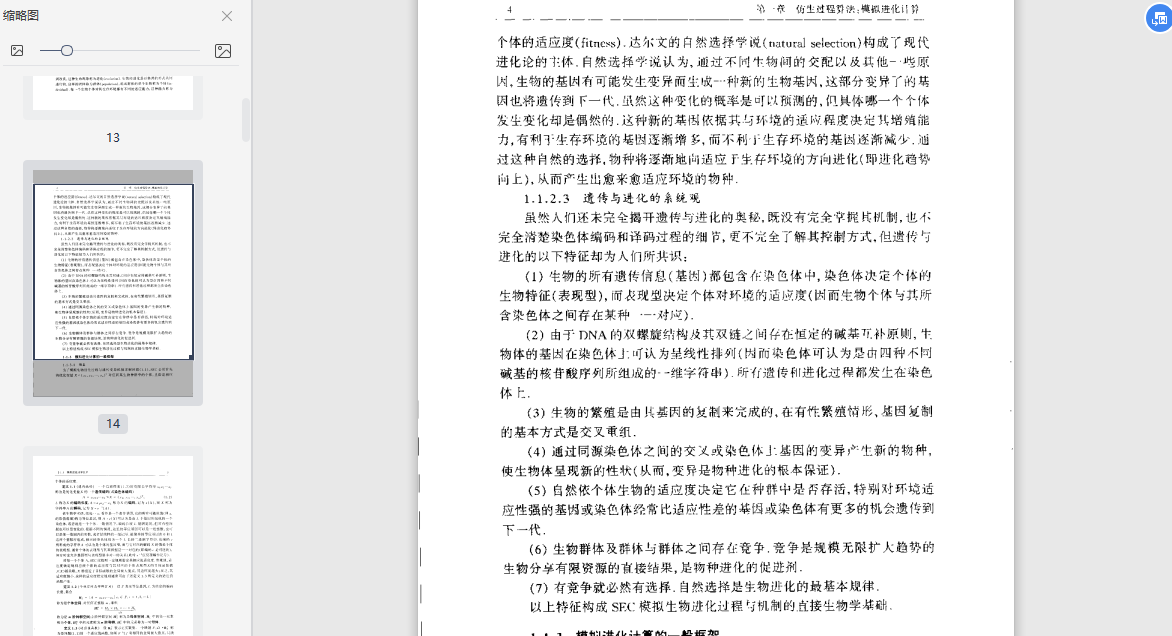 模拟进化计算(simulated evolutionary computation,简称SEC).$1.1慨述SEC的基本原理、生物基础、算法框架、本质优点与适用领域:$1.2介绍SEC的基本要素,定义遗传编码、适应性度虻、选择算子、交叉算子、变异算子等基本模拟演化操作;S1.3更为细致地讲述SEC:的一类最具代表性的执行策略--遗传算法(genetic algorithm,简称GA),介绍包括并行、混合、自适应、共享、适应值变换、效率加速等在内的各种势法执行技巧;§1.4阐述GA的搜索机制;51.5介绍GA的收敛性理论,最后,$1.5简述SEC的发展历史并指出SEC当前研究的热点问题