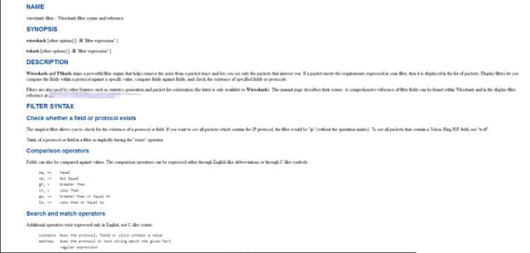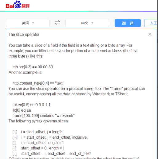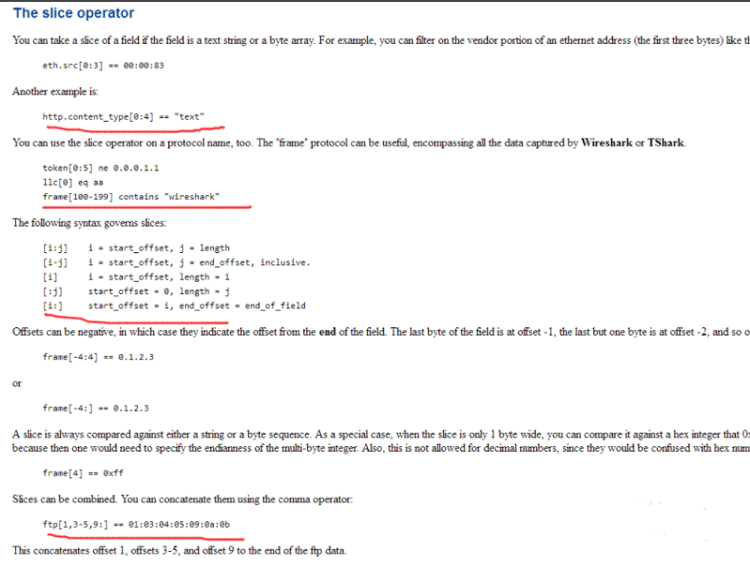 3、在弹出的帮助文档页面上,找到wireshark的内容过滤的规则语法,所有的协议过滤都是如此,提供了基本的中括号运算符 “[]”进行内容的提取和判断