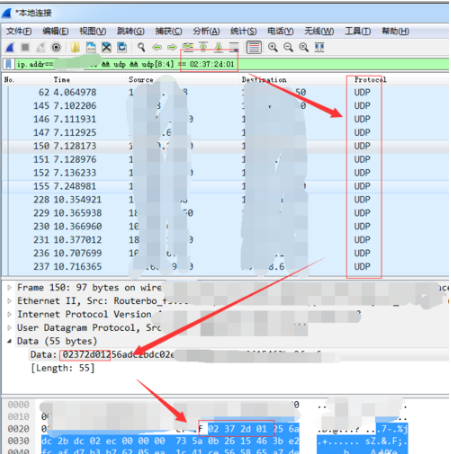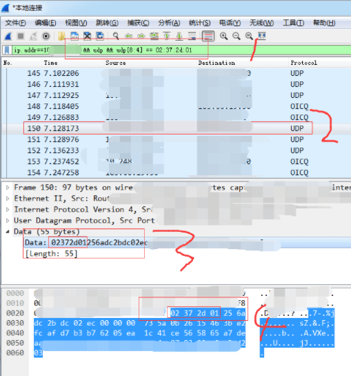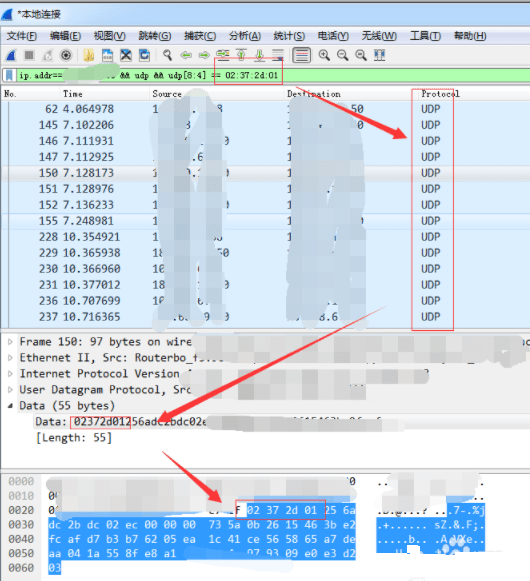 4、接下来小编将以udp包进行内容筛选,过滤地址:***** udp数据前个四字节要等于0x02:0x37:0x2d:0x01 的数据包。如:ip.addr==xx.xx.xx.xx && udp && udp[8:4] == 02:37:2d:01