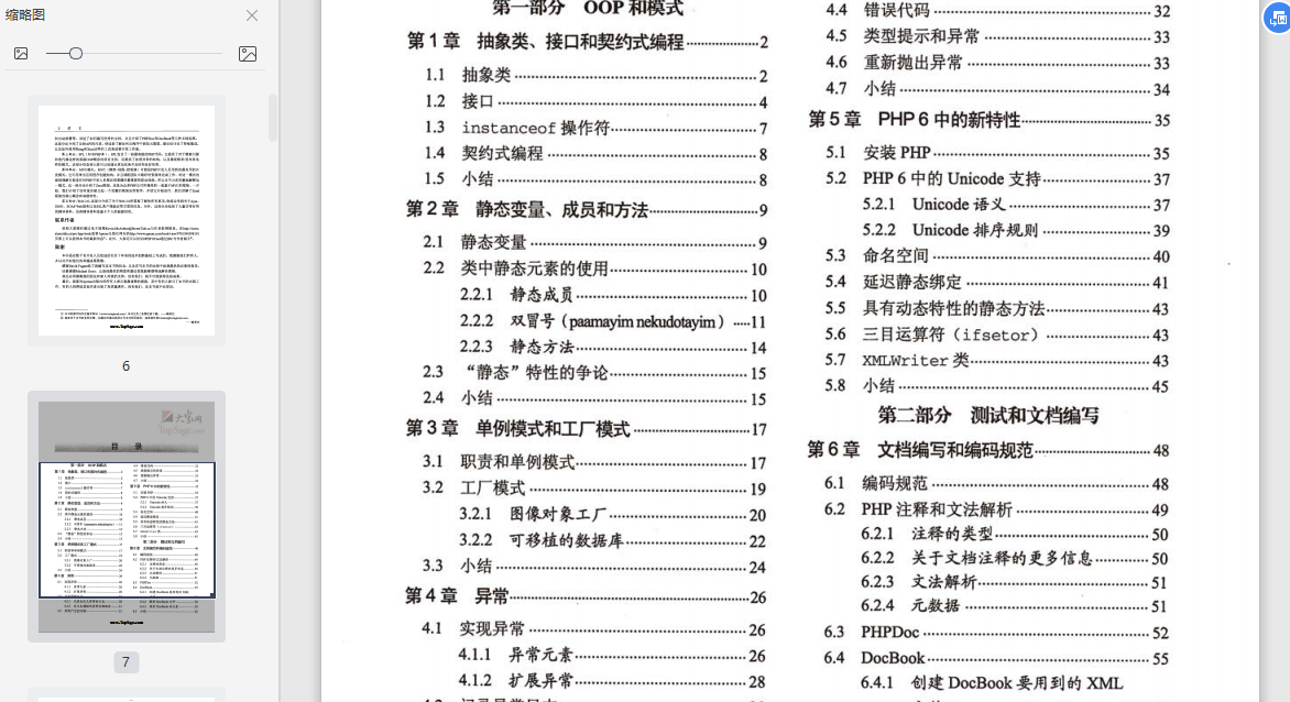 第一部分,OOP和模式。这部分是学习高级的OOP概念必备的基础知识。该部分直接进入主题,讲解了抽象类、接口、静态方法、单例和工厂之类的模式,以及异常等内容。最后介绍了PHP