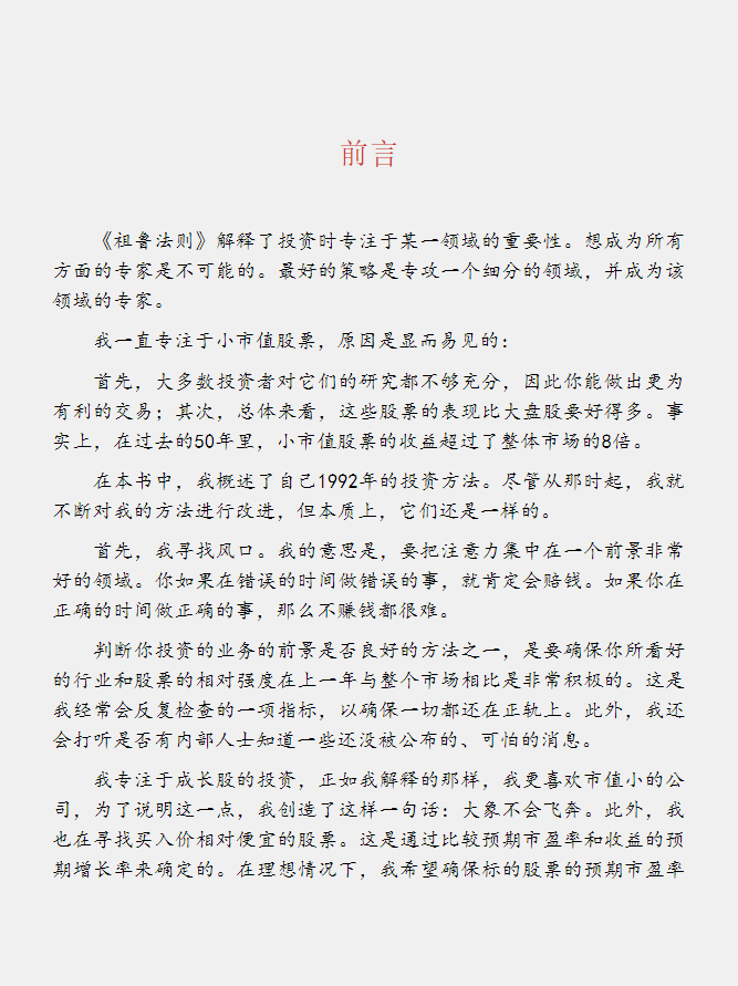 “祖鲁法则”强调聚焦、投资那些价格被低估的小型公司股票,这样,个人投资者能够从他们的投资中获得尽可能多的利润。本书的主要目的是告诉个人投资者如何识别及选择绩优成长股,并且保证他们了解如何以合适的价格买入,以获得高额回报。一旦投资者对他们选股的分析能力更加自信,在任何时候,他们都不用再担心市场的波动。