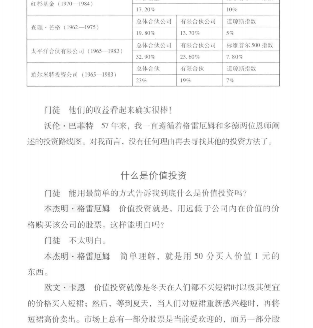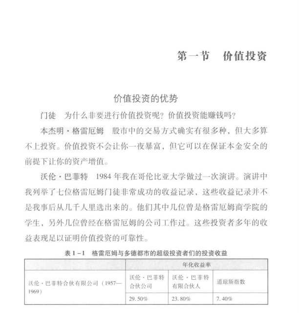 沃伦·巴菲特1984年我在哥伦比亚大学做过一次演讲。演讲中我列举了七位格雷厄姆门徒非常成功的收益记录,这些收益记录并不是我事后从几千人里选出来的。他们其中几位曾是格雷厄姆商学院的学生,另外几位曾经在格雷厄姆的公司工作过。这些投资者多年的收益表现足以证明价值投资的可靠性。