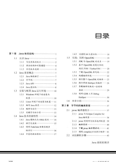 从本书的第1章开始,笔者首先对Java的体系结构做了一个简单且全面的介绍,让大家深刻认识到了Java虚拟机在Java平台中所占的分量,然而这一章的重点则是在OpenJDK和HotSpot VM的编译实战任务上。当大家对Java虚拟机有了一个简单的了解后,本书的第2章则开始对字节码的编译原理进行了讲解,因为大家有必要了解Java语言规范与JVM规范之间的区别,以及Java代码究竞需要经历哪些步骤之后才能够被编译为一个有效的字节码文件。而本书的第3章则与上一章息息相关,当大家了解字节码的编译原理后,接下来笔者将会对字节码的内部组成结构进行深入讲解。本书的第4-6章涉及HotSpot VM的部分源码实现,从Launcher启动HotSpot VM开始,到HotSpot VM的初始化过程都是每一个Java开发人员必须掌握和了解的。对于大部分Java开发人员而言,对Java虚拟机最感兴趣的内容莫过于内存管理和垃圾收集,本书用了大量的篇幅来对这些技术进行讲解,并且对Java7新增的G1收集器也做了介绍。在本书的第7章中,笔者对类加载机制进行了讲解,帮助大家对类的初始化过程理解透彻。然而在本书的最后一章中,笔者对HotSpot VM的架构模型和执行引擎进行了深入讲解,毕竟执行引擎是Java虚拟机中最重要同时也是最核心的部分,运行时编译技术使得Java程序的运行性能从此有了质的飞越