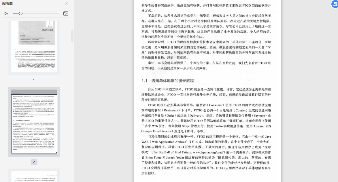 第1章描述了所谓“单体地狱”的症状,当单体应用程序超出其架构时会出现这种问题,这可以通过采用微服务架构来规避。这一章还概述了微服务架构模式语言,这也是本书大部分内容的主题。
