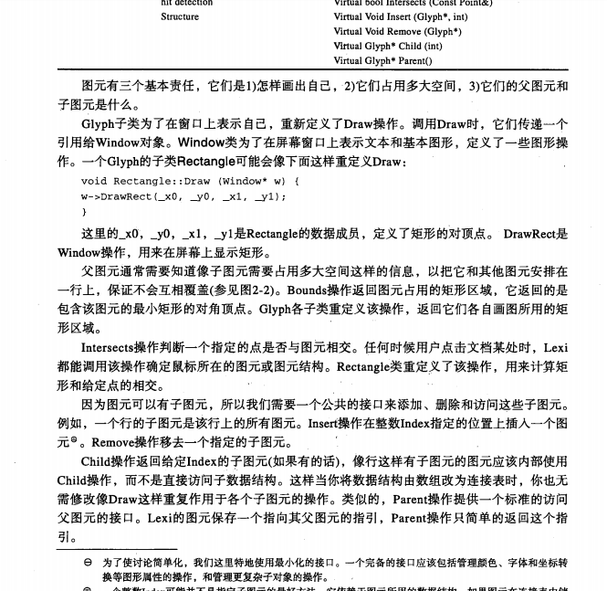 3)修饰用户界面Lexi的用户界面包括滚动条、边界和用来修饰WYSIWYG文档界面的阴影。这些修饰有可能随着Lexi用户界面的演化而发生变化。因此,在不影响应用其他方面的情况下,能自由增加和去除这些修饰就十分重要了。