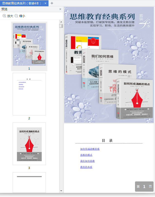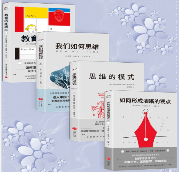 将教育的本质,我们如何思维,思维的模式和如何形成清晰的观点四本书合在一起的套装版本,思想教育经典系列给大家,它将帮你突破本能禁锢,打破狭窄视角,激发无数创意,实现学习、职场、生活的高效提升。